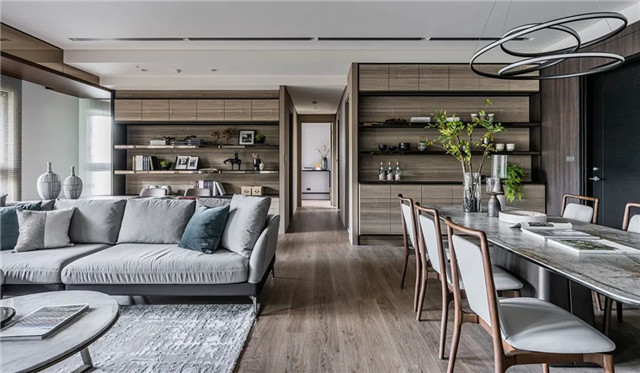 一席深褐长桌紧偎著沙发