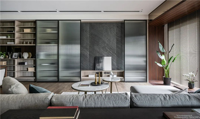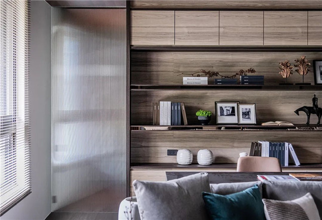 紧邻相依的是胡桃木格栅,俐落直立线条与